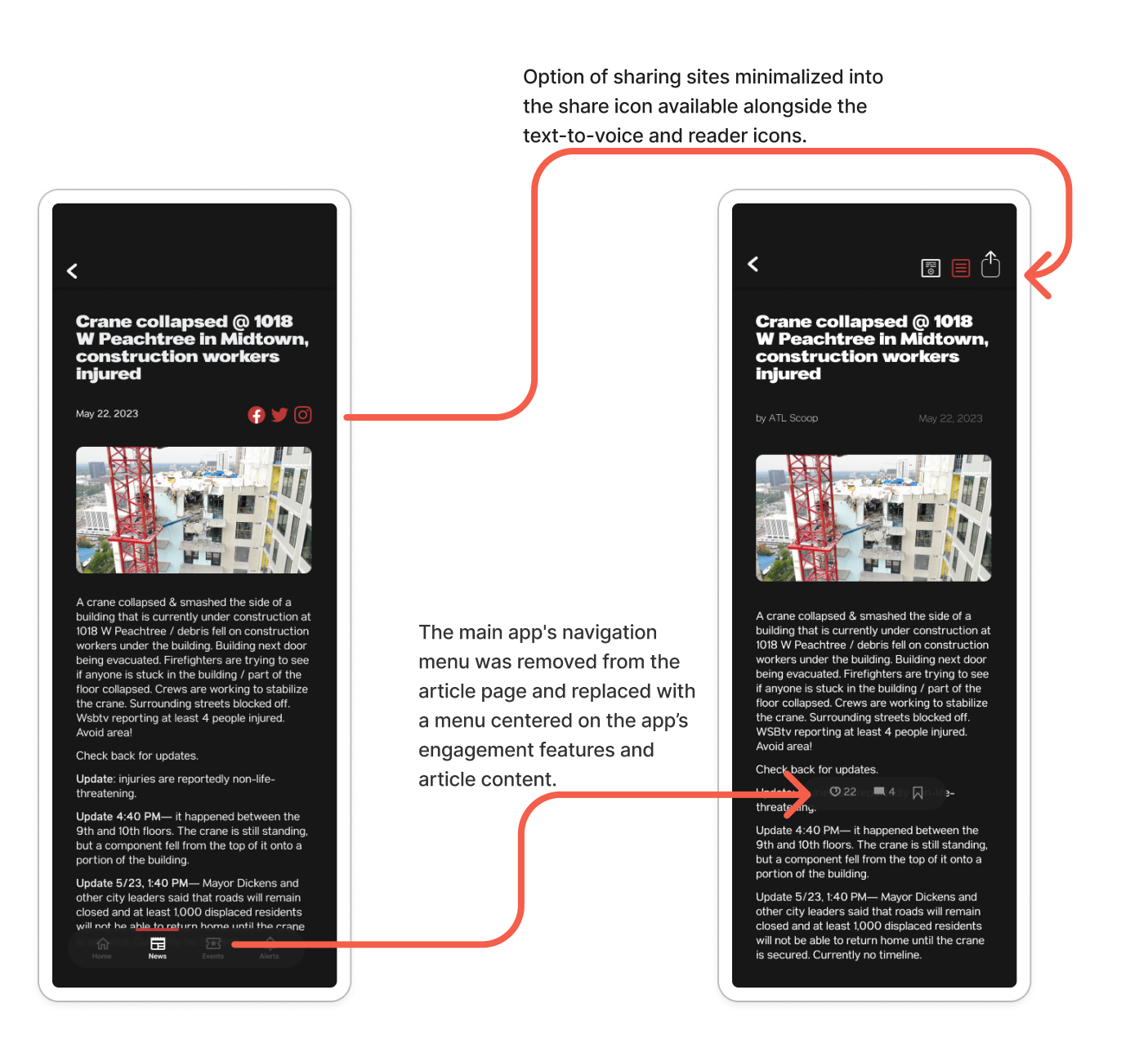 Icons for sharing on various social sites were removed from near the article title and replaced with a share icon in the header for easier access. A new navigation bar, fixed to the bottom of the page, was added to allow users to comment, like, and bookmark articles.